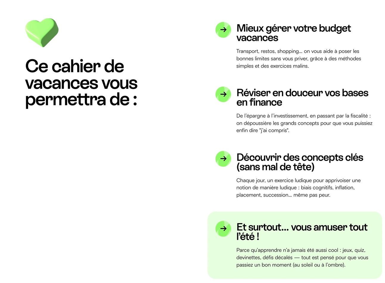 Au programme : quiz, exercices pratiques et mini-cas concrets pour tester vos connaissances et renforcer vos réflexes d’investisseur, le tout dans un format léger, ludique et pédagogique