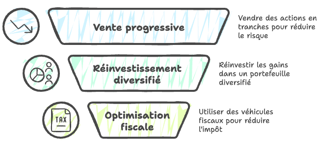 Imaginons un salarié possédant 50 000 € en actions de son entreprise. Une stratégie raisonnable pourrait être :
